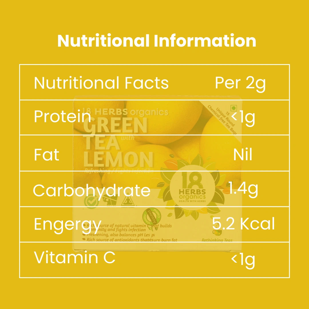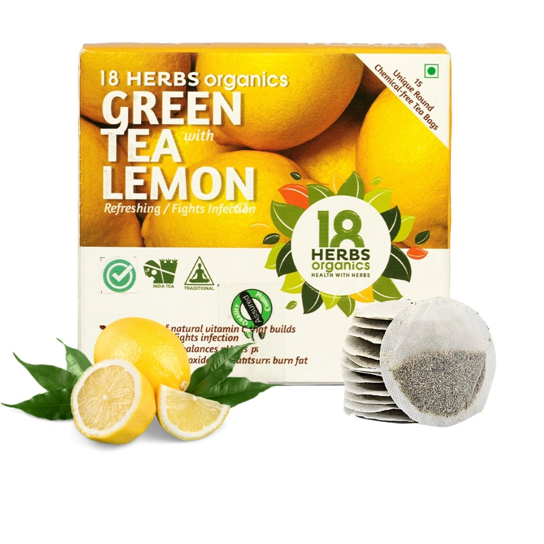 18 HERBS ORGANICS Premium Green tea with Lemon is produced by a special process ensuring maximum retention of catechins (the main source of the desired antioxidant properties in Green Tea) and freshness of Lemons. Lemon fruit is carefully sourced from Puliyankudi tracts of South.