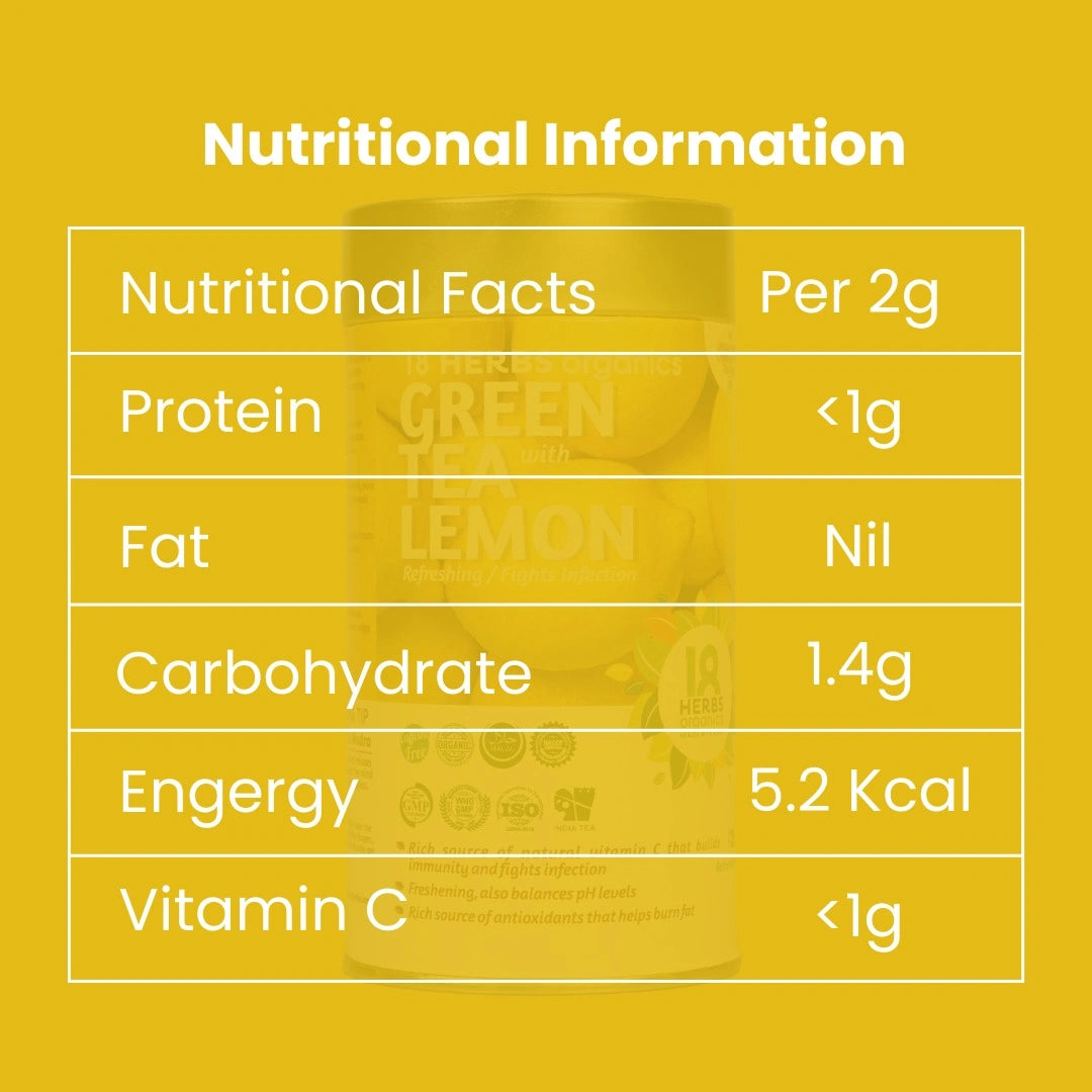 18 HERBS ORGANIC Premium Green tea with Lemon is made using a special process that ensures maximum catechin retention (the main source of the desired antioxidant properties in Green Tea) and the freshness of the Lemon. Lemon fruit is carefully sourced from the southern Puliyankudi tracts.