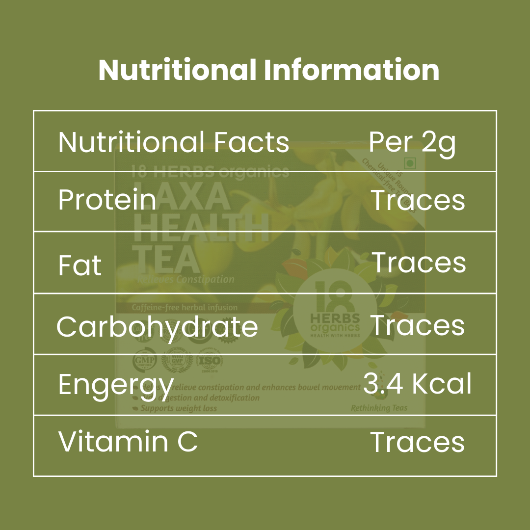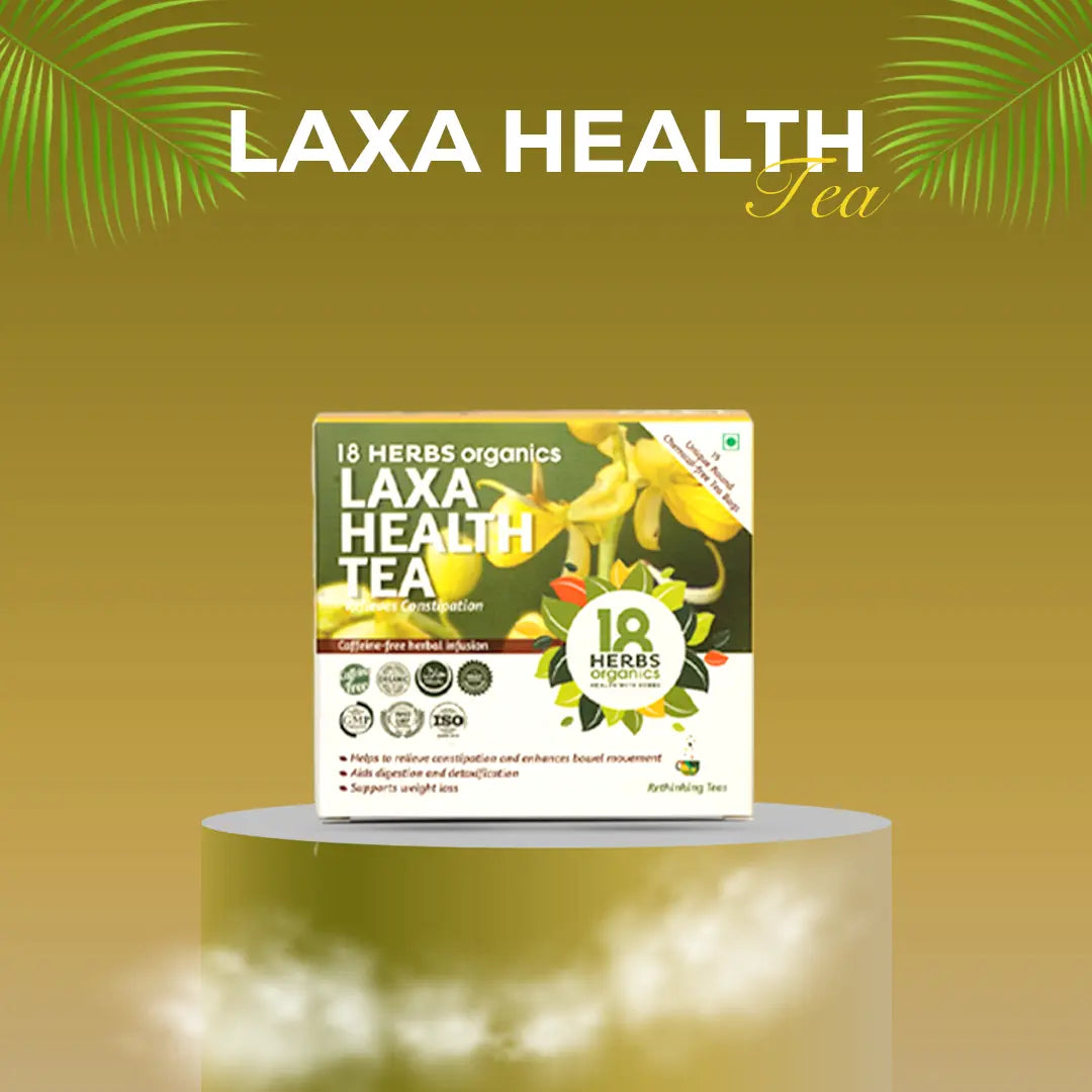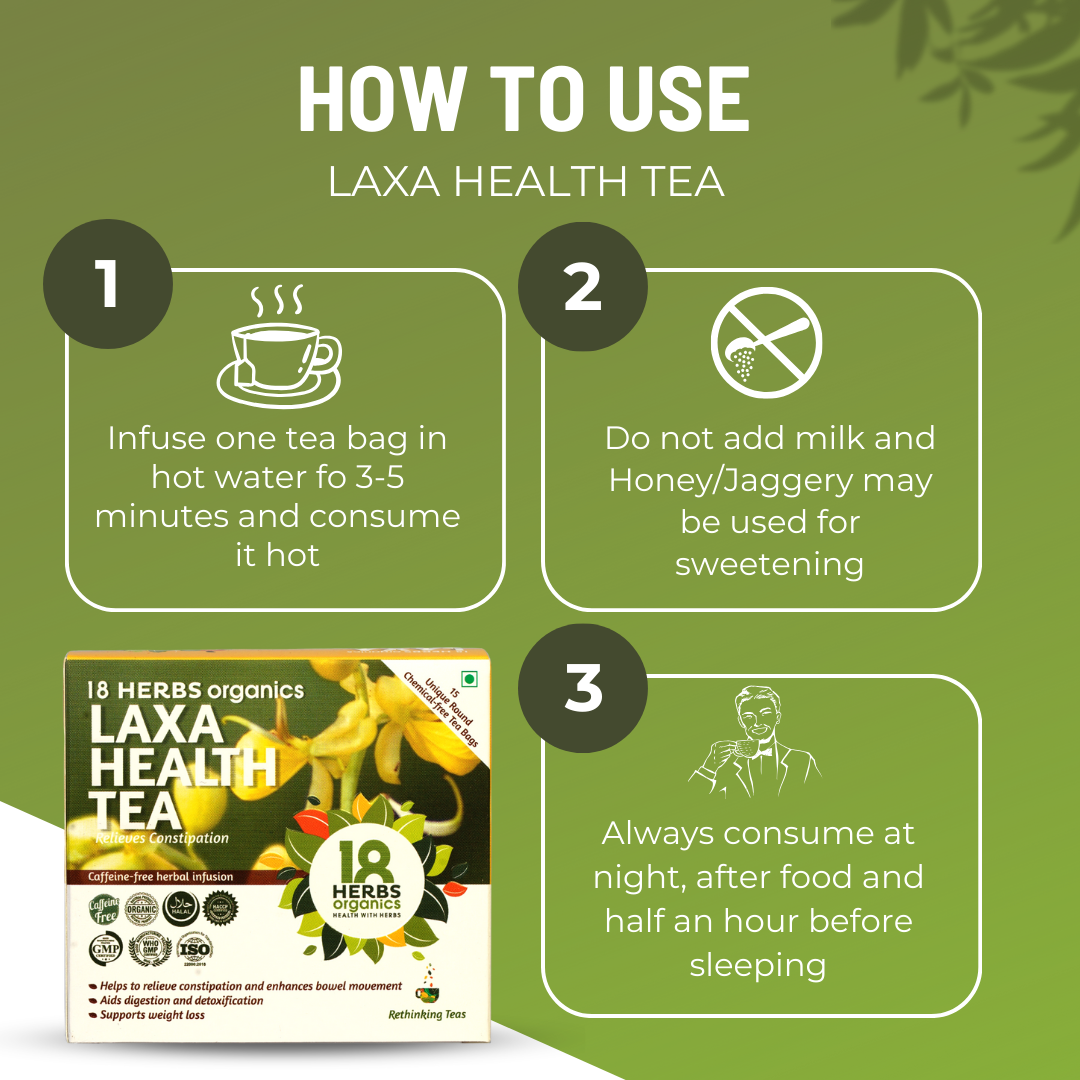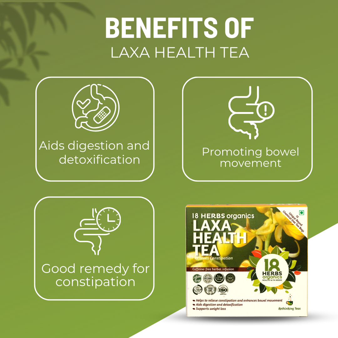 18 HERBS ORGANICS LaxaHealth Tea contains 100% pure cut leaves of organically grown Senna herb (Cassia Angustifolia) sourced from the calcareous soil tracts of Tirunelveli, South India.
