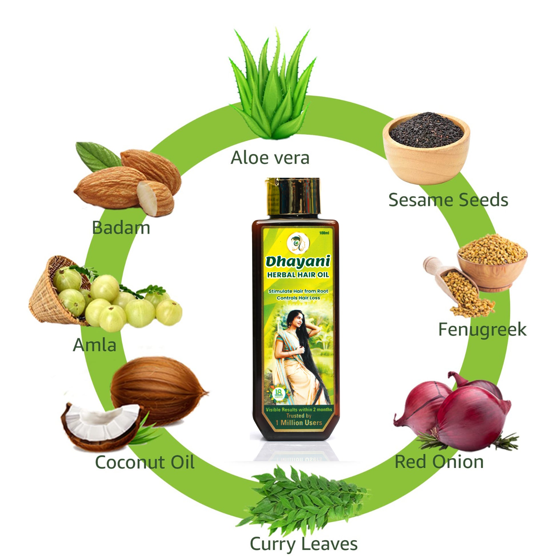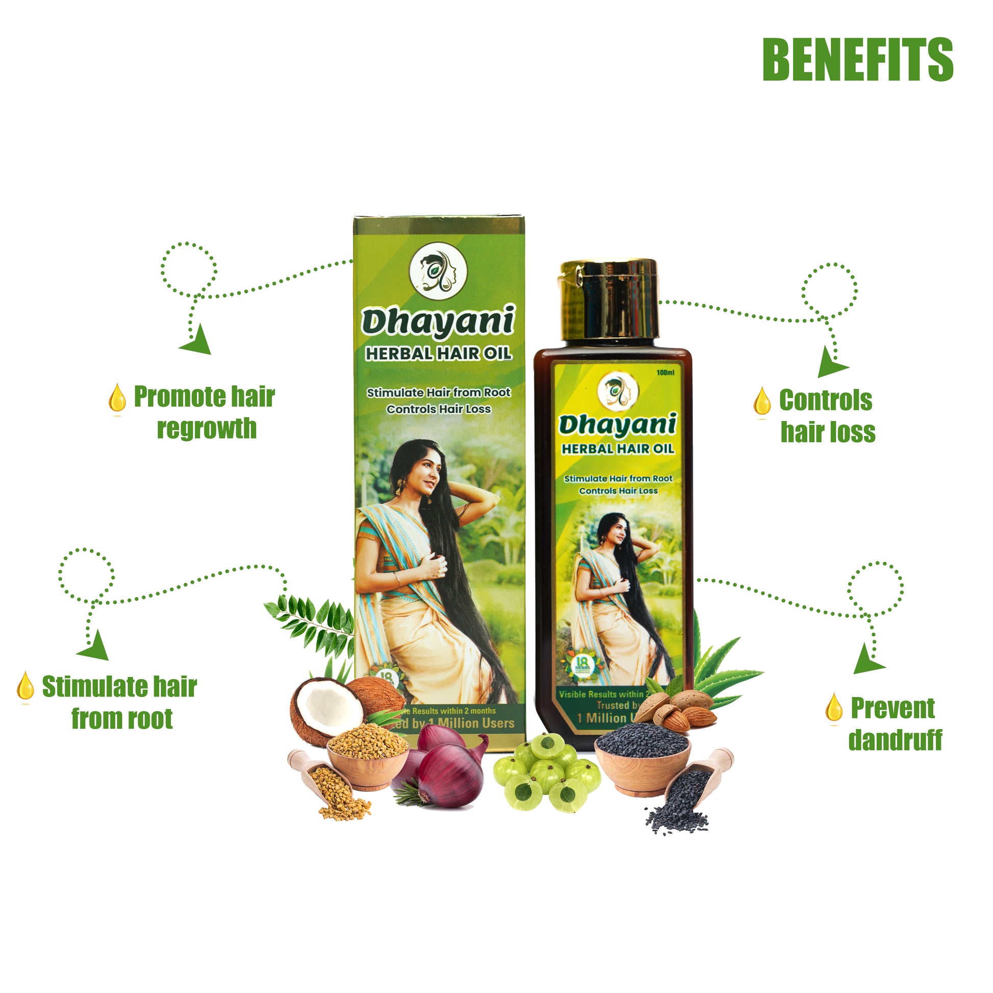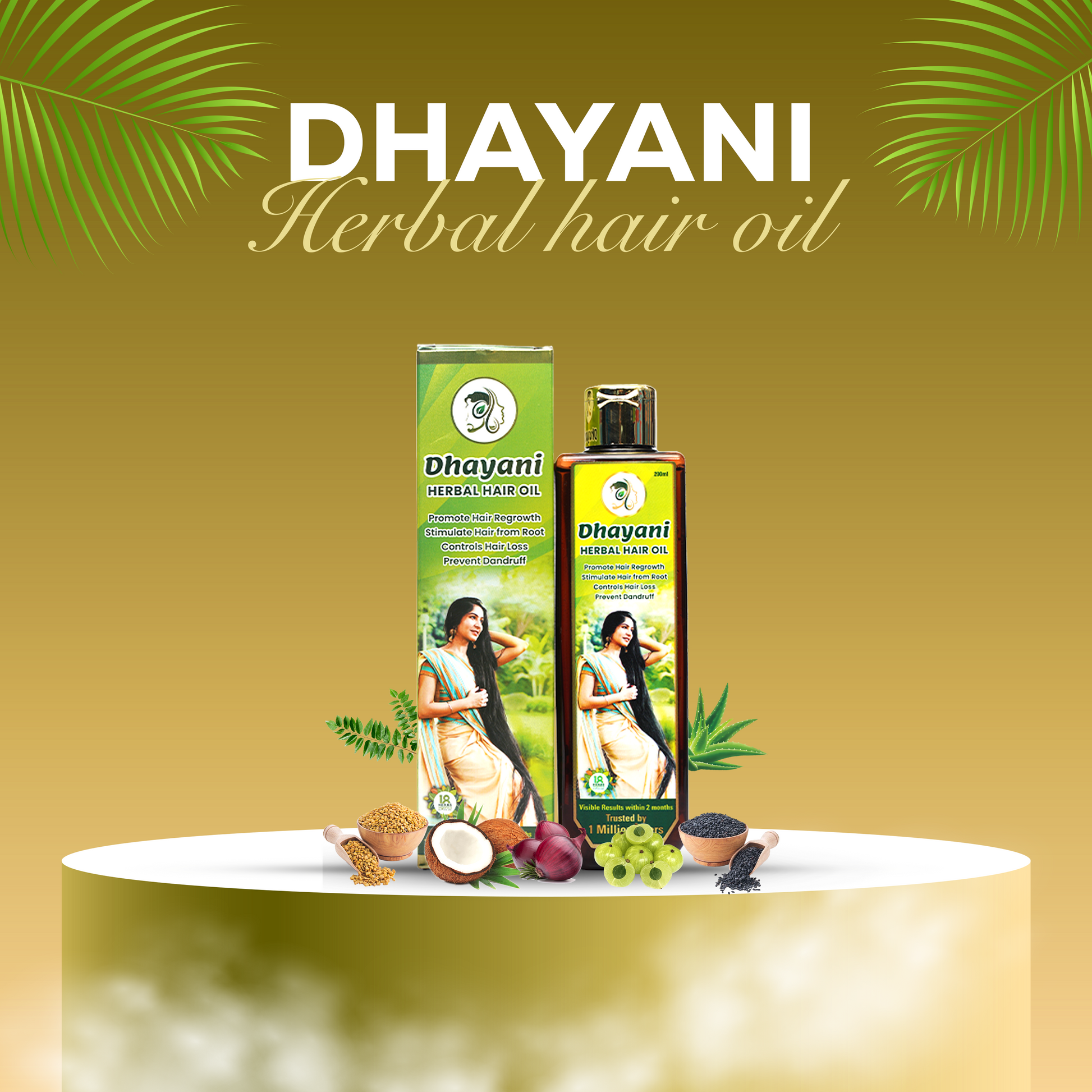 DHAYANI HERBAL HAIR OIL is a new innovative success formula for hair care industry. This herbal oil helps in hair regrowth, controls hair loss and reduces dandruff. Our no toxins and no harmful chemicals philosophy makes the oil completely herbal.